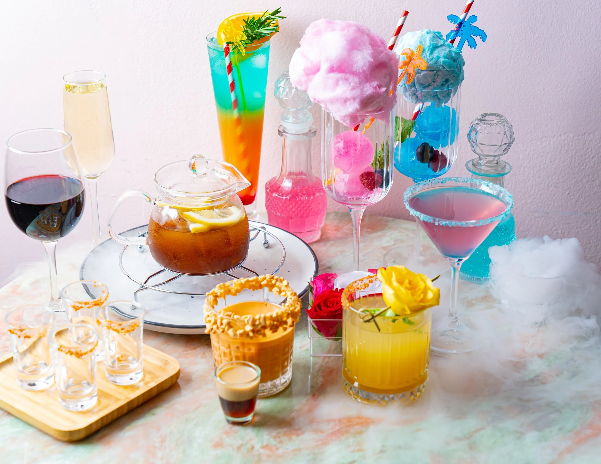 Lychee Kiss ( Lychee, Mint, Citrus ) / Strawberry Lover ( Strawberry, Mint, Citrus ) / Lavender Lilac ( Lavender, Butterfly pea, Citrus )/ Fizzy Blue Hawaii(Blue curacao, Lemonade, Mint)